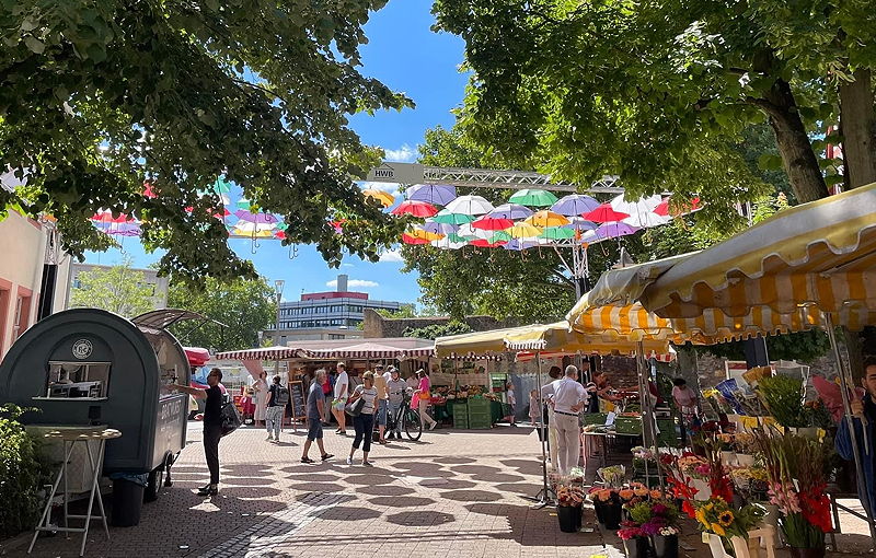 Mit dem Frühling kommt auch der Feierabendmarkt aus der Winterpause zurück. Los geht es am Donnerstag, 24. April, von 16 bis längstens 22 Uhr auf dem Ludwig-Meidner-Platz. Danach geht es wöchentlich weiter bis zunächst 3. Juli 2025. An den Feiertagen 1. Mai, 29. Mai und 19. Juni finden keine Märkte statt. Nach einer Pause während der Sommerferien geht es dann wieder am 21. August los, bis am 25. September die Saison endet. Für ein tolles Ambiente am Feierabendmarkt sorgen die bunten Schirme die als Dach über den Platz gespannt sind.